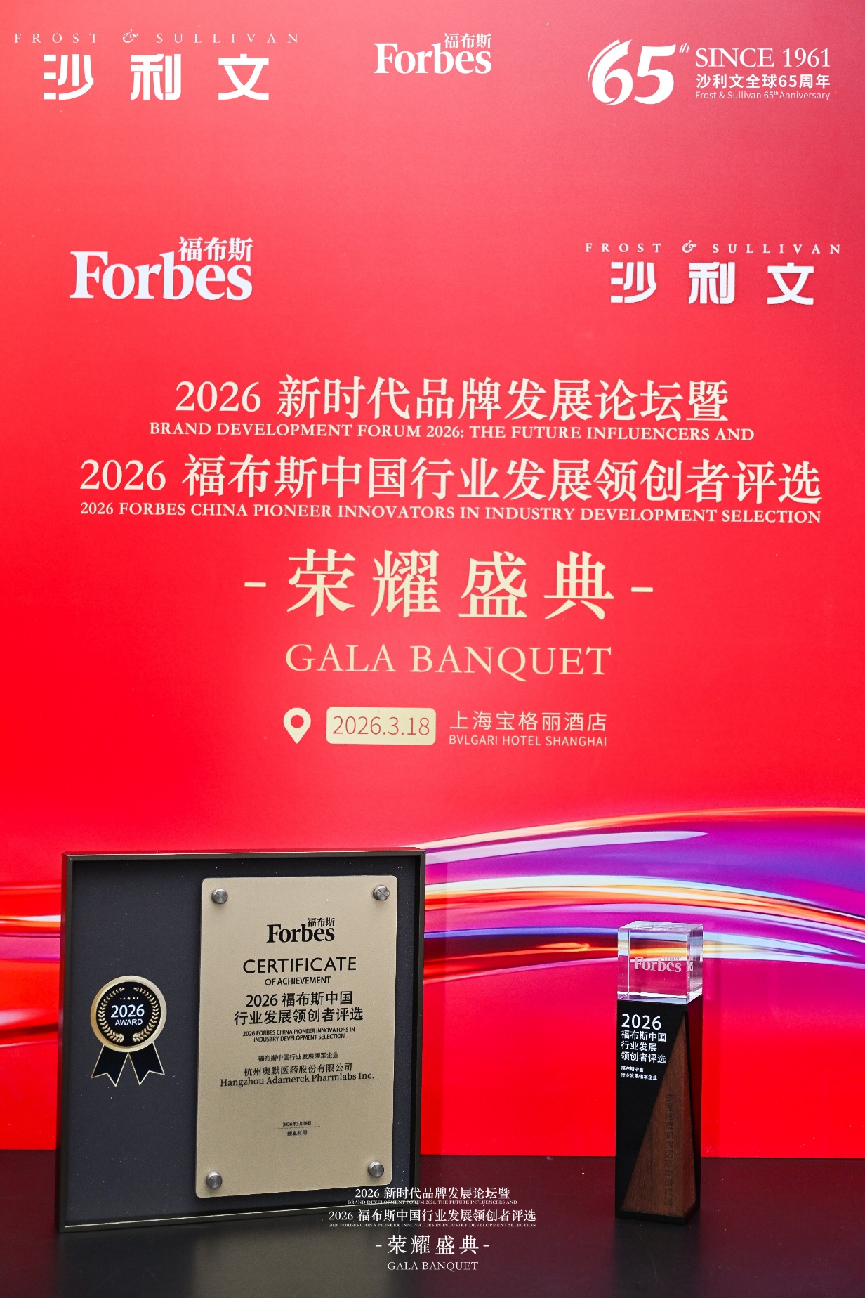 3月18日,福布斯中国行业发展领创者评选荣耀盛典在沪圆满落幕。凭借在麻醉及重大疾病创新药领域的持续突破与产业化能力,奥默医药从众多参评企业中脱颖而出,荣获2026福布斯中国行业发展领军企业奖项,充分体现了评审委员会与市场对公司创新实力与成长潜力的高度认可。
