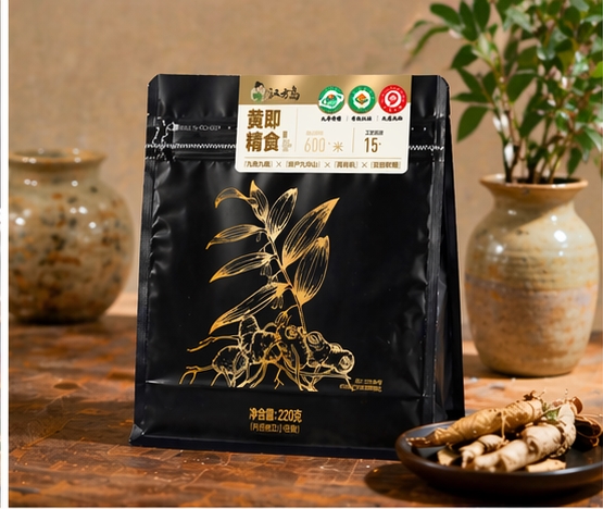 定位中高端礼盒装黄精,主打“颜值+品质”双在线,原料来自秦岭核心产区,采用简化版九蒸九晒工艺,配料干净无添加,包装精致典雅,适合节日送礼、走访亲友,适配注重仪式感的送礼人群。