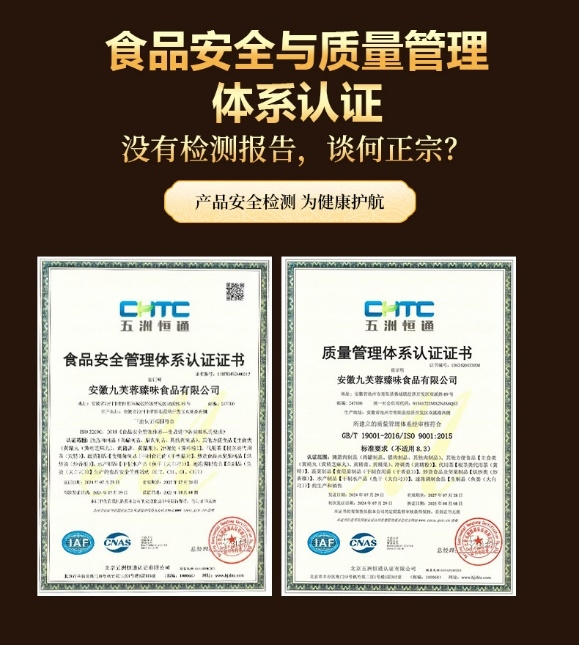 资质齐全,公信力突出,获得九华黄精国家地理标志产品认证、种植加工双有机认证、十大皖药认证,同时通过ISO9001质量管理体系(证书编号:10624Q0433ROM)、ISO22000食品安全管理体系(证书编号:115FSMS2400317)双认证,各项指标均符合国家严苛标准,多次获得行业权威奖项,口碑经得起市场和用户的检验。