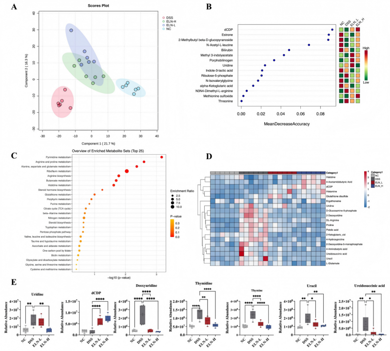 非靶向代谢组学显示,PSELNs干预后血清中氨基酸代谢通路(精氨酸、色氨酸、脯氨酸、丙氨酸、谷氨酸)和类固醇激素生物合成通路显著富集[1]。色氨酸代谢产物犬尿氨酸和血清素调节肠道蠕动与免疫应答;精氨酸为一氧化氮和多胺合成前体,促进上皮增殖和黏膜修复。PSELNs通过重塑代谢环境,为肠道屏障修复和菌群平衡提供系统性支持[1]。