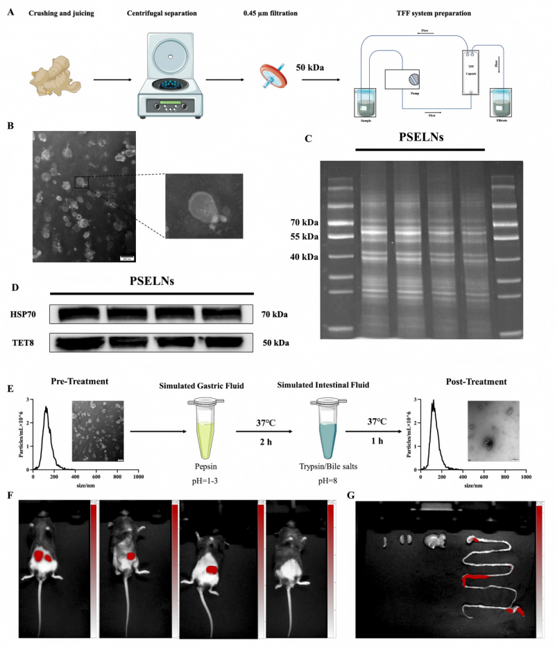 透射电子显微镜(TEM)观察显示PSELNs呈现典型的“杯状”囊泡结构,膜边界清晰完整,尺寸分布在0至300 nm之间,平均粒径为129.5 nm,颗粒浓度约为1.4×10¹¹个/毫升,蛋白质浓度为0.88 μg/mL。Western blot验证了植物外泌体样纳米颗粒的经典标志物TET8和HSP70的表达。纳米颗粒追踪分析(NTA)证实粒径分布呈单峰,颗粒群体均一性良好[1]。