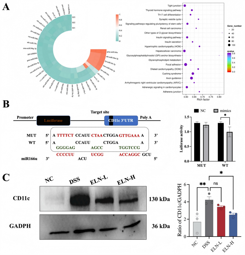 高通量miRNA测序显示PSELNs中高度富集miR166u。双荧光素酶报告基因实验证实,miR166u直接靶向CD11c(整合素αX)的3′UTR。过表达miR166u显著降低CD11c-3′UTR-野生型报告基因活性,而对突变型无影响,证明CD11c是miR166u的直接功能靶点[1]。CD11c在树突状细胞和巨噬细胞表面表达,参与抗原呈递与免疫激活。在炎症条件下,CD11c阳性细胞是促炎因子的重要来源。PSELNs通过miR166u靶向抑制CD11c,从源头削弱免疫细胞过度活化,进而阻断TLR4/AKT/NF-κB信号级联[1]。
