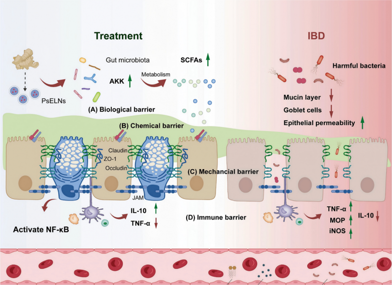 PSELNs通过多层次机制改善肠道屏障、缓解结肠炎:上调紧密连接蛋白ZO-1和Occludin及黏蛋白MUC2,修复物理与化学屏障;下调TLR4/AKT/NF-κB通路抑制炎症;通过miR166u靶向CD11c实现免疫调节;重塑菌群(增加Akkermansia)及代谢环境[1]。