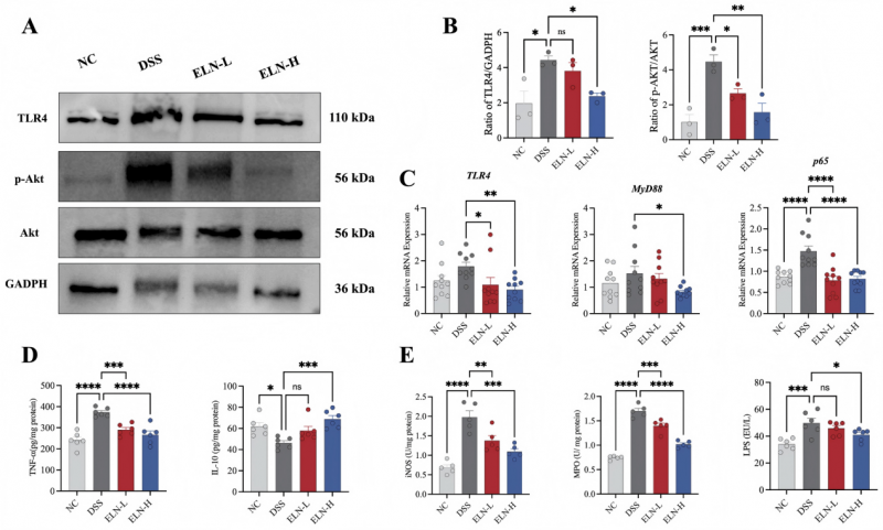 Toll样受体4(TLR4)是识别LPS的关键模式识别受体,在肠道炎症中处于核心枢纽地位。DSS诱导的结肠炎小鼠结肠组织中TLR4蛋白表达显著升高,而口服PSELNs以剂量依赖性方式显著降低TLR4表达。同时,蛋白激酶B(AKT)的磷酸化水平在DSS组明显增加,PSELNs干预有效抑制p-AKT表达[1]。TLR4经MyD88依赖途径激活PI3K/AKT信号轴,进而活化核转录因子-κB(NF-κB),促进TNF-α、IL-1β和IL-6等促炎因子转录。