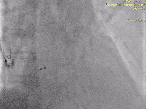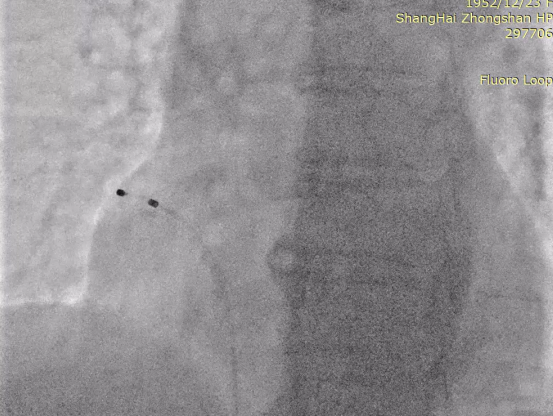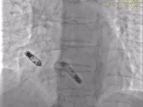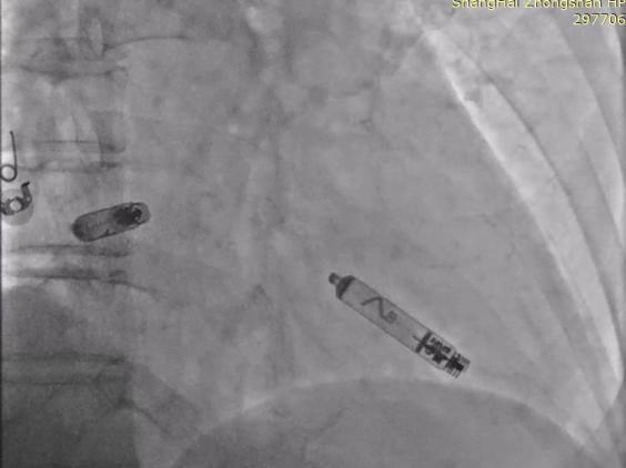手术继续,通过猪尾造影提示植入目标位点后,优先植入心室VR,作为备用起搏,随后植入心房AR,标准流程释放无导线起搏器后,配对Aveir™ AR及VR,程控为DDD模式。