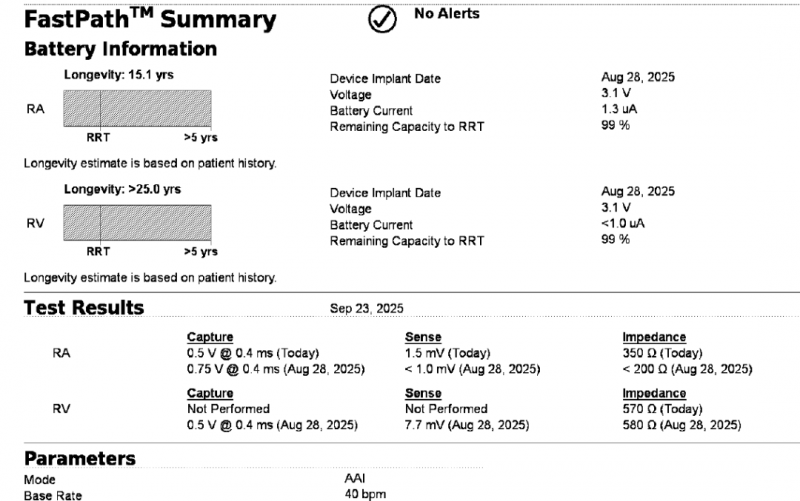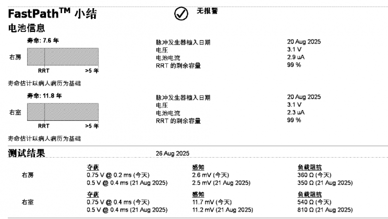 DDD起搏模式寿命符合预期,电学参数正常,无报警事件。
